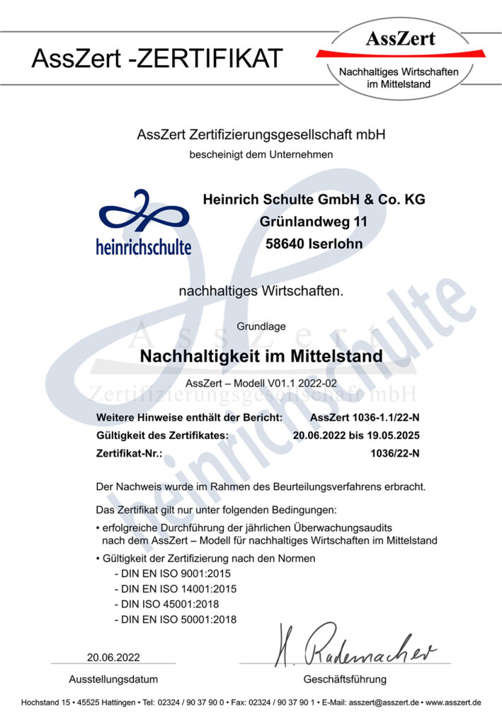 Die Herstellung von Produkten bei Heinrich Schulte geschieht unter dem Gesichtspunkt der Nachhaltigkeit, unter Beachtung der Mitarbeitergesundheit- und Weiterentwicklung.